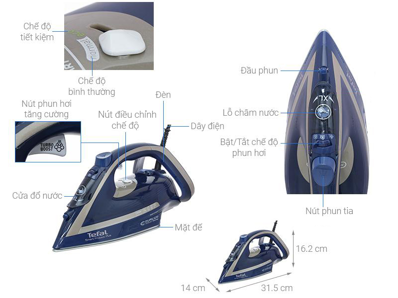 - Bàn ủi Tefal có công suất lên đến 2800W làm nóng bàn ủi nhanh, ủi đồ nhanh chóng, tiết kiệm thời gian ủi đồ. Hơi phun mạnh mẽ 40 g/phút, hơi phun tăng cường 260 g/phút.