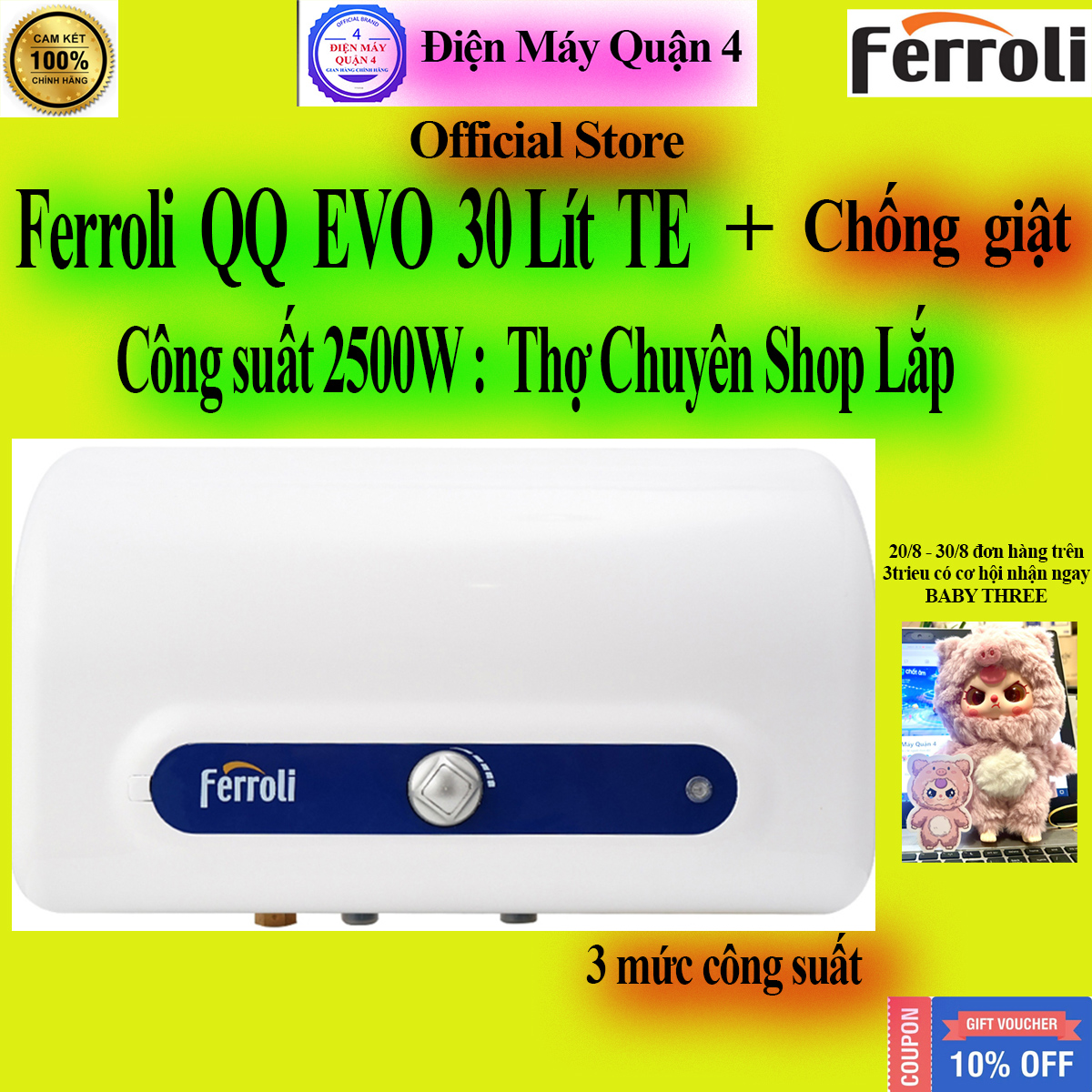 Máy nước nóng Ferroli QQ Evo TE có thanh Mg anode làm mềm nước, bảo vệ ruột bình, cho chất lượng nước tốt. Bên cạnh đó, máy còn được trang bị có chế độ chống giật ELCB an toàn, an tâm khi sử dụng cho gia đình có con nhỏ.