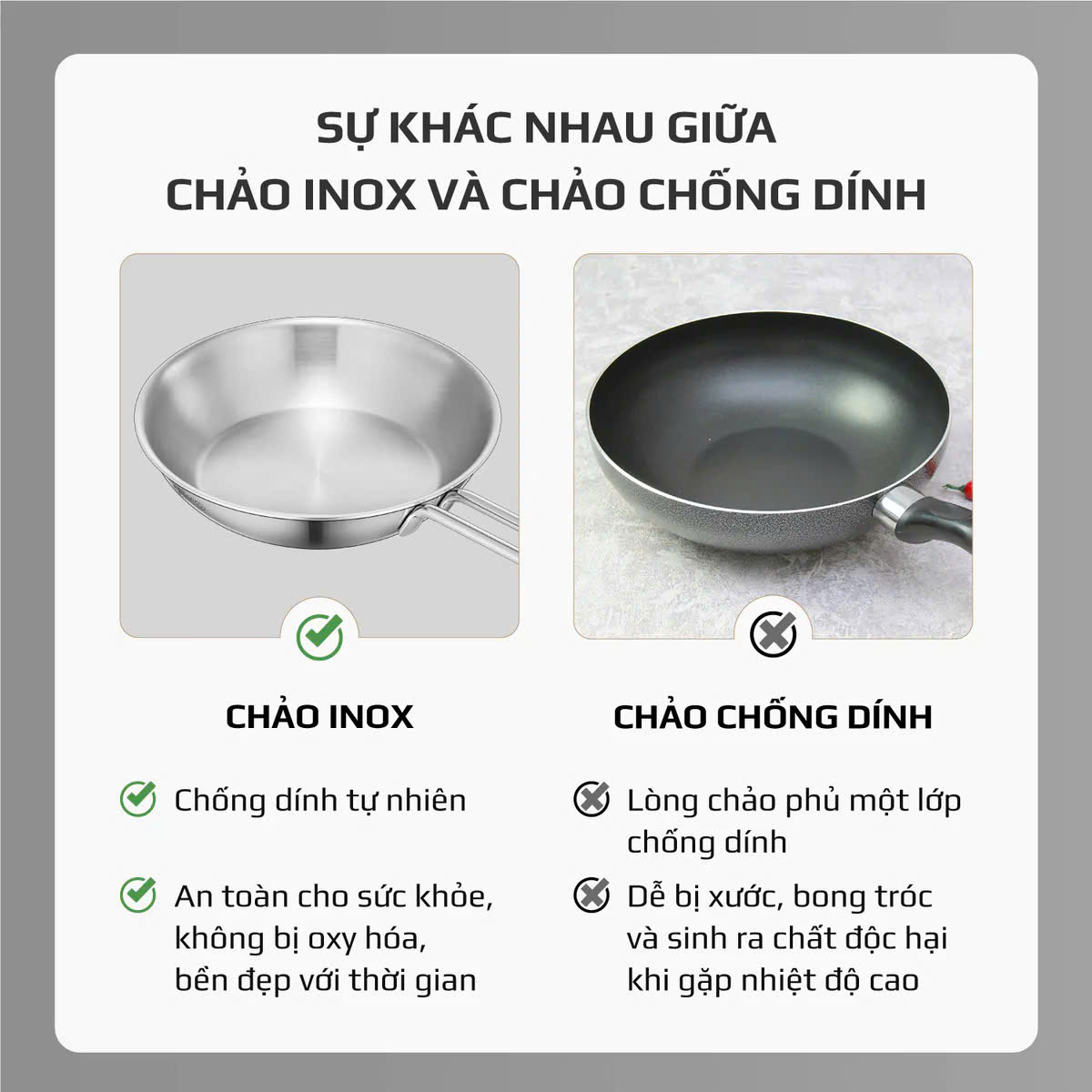 - Chảo INOX chống dính tự nhiên là một lựa chọn tốt cho những ai quan tâm đến độ bền, an toàn cho sức khỏe và khả năng chống dính hiệu quả.