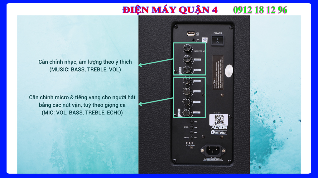 Loa Acnos CS141 được trang bị hệ thống loa chất lượng cao, bao gồm 1 loa Bass 2 tấc (20cm) và 1 loa Treble . Loa có công suất lên đến 70W, cho âm thanh mạnh mẽ, sống động và đầy đủ các dải tần. Loa Acnos CS141 được tích hợp vang số chỉnh cơ, giúp bạn dễ dàng điều chỉnh âm thanh phù hợp với sở thích của mình. Loa cũng được trang bị chức năng chống hú di tần, giúp bạn hát karaoke thoải mái mà không lo bị hú. Đầy đủ hiệu ứng Bass Boost , Revert , Echo.
