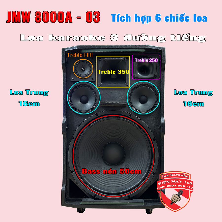 Phiên bản nâng cấp Loa kéo công suất lớn thùng gỗ thuộc dòng JMW J8000a-03 được tích hợp 6 chiếc loa. Loa chủ lực phải kể đến là chiếc loa chủ bass nén lên đến 50cm phụ trách giải âm trầm sâu và uy lực, bên cạnh đó là sử dụng đến 2 chiếc loa trung lên đến 16cm giúp truyền tải giọng hát karaoke cũng như chi tiết dãi âm trung của nhạc nền sáng nổi trội hơn những dòng loa kéo hiện có trên thị trường.