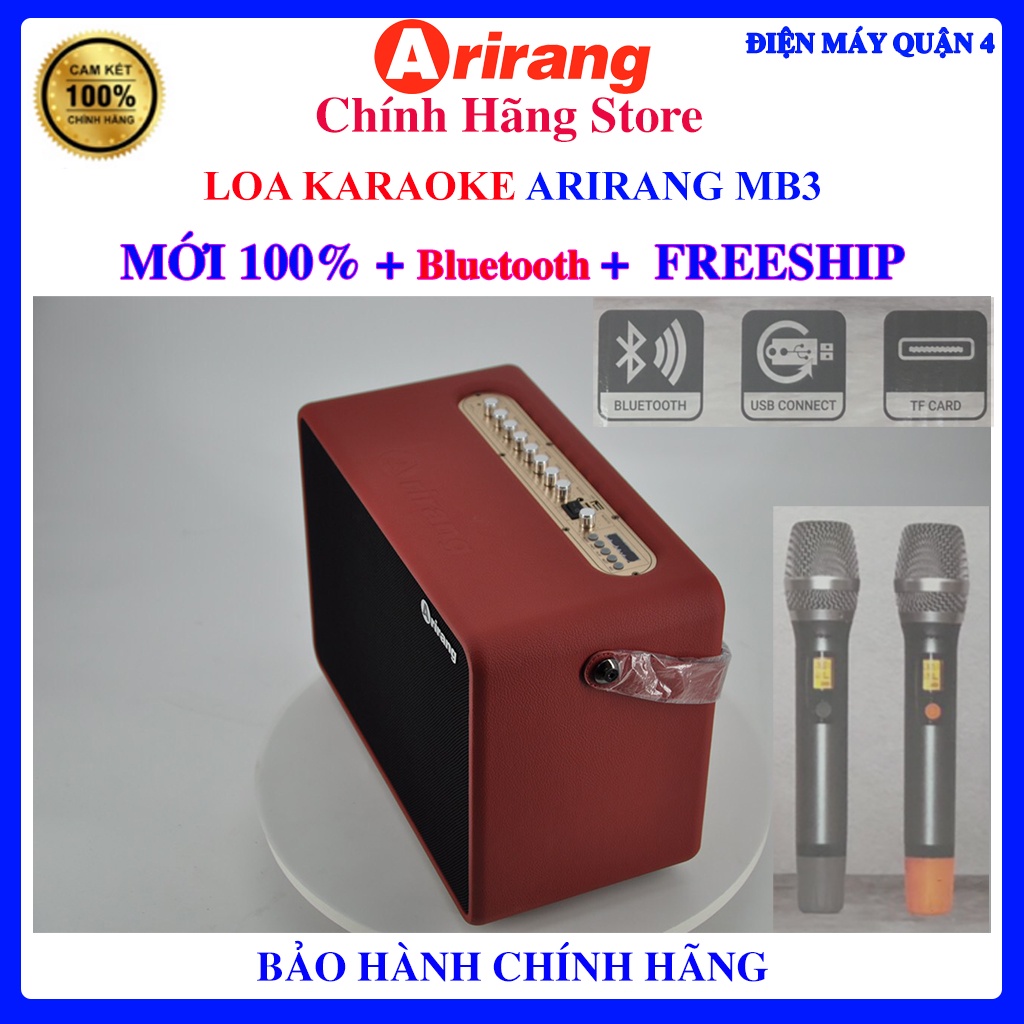 Loa kéo Arirang MB3 là mẫu loa với thiết kế nhỏ gọn thuận tiện mang theo phù hợp hát karaoke, nghe nhạc ở bất cứ đâu mà bạn muốn dù là ở nhà hay ra ngoài và cả mang theo khi đi du lịch.Bạn hoàn toàn có thể yên tâm về chất lượng âm thanh mà Arirang MB3 có thể mang lại khi sản phẩm này sở hữu một hệ thống 3 loa, 3 đường tiếng với Bass 20cm, loa Trung 8cm và loa Treble 4cm cùng kết hợp cùng bộ xử lý âm thanh DSP tiên tiến đảm bảo có thể mang lại cho bạn chất lượng âm thanh đầu ra cực tốt cùng với đó là công suất PMPO: 350W và RMS: 90W.Thêm vào đó, sản phẩm loa này cũng mang lại sự tiện lợi hoàn toàn cho người sử dụng khi đã đi kèm ngay trong hộp 2 Micro không dây dải tần UHF giúp bạn có thể hát ngay mà không cần mua thêm micro và cũng không cần đến dây kết nối micro cùng với đó là khả năng kết nối có dây đa dạng chuẩn kết nối, trang bị Bluetooth tiện lợi, khả năng tùy chỉnh dễ dàng và thời lượng pin lên tới 6 giờ.