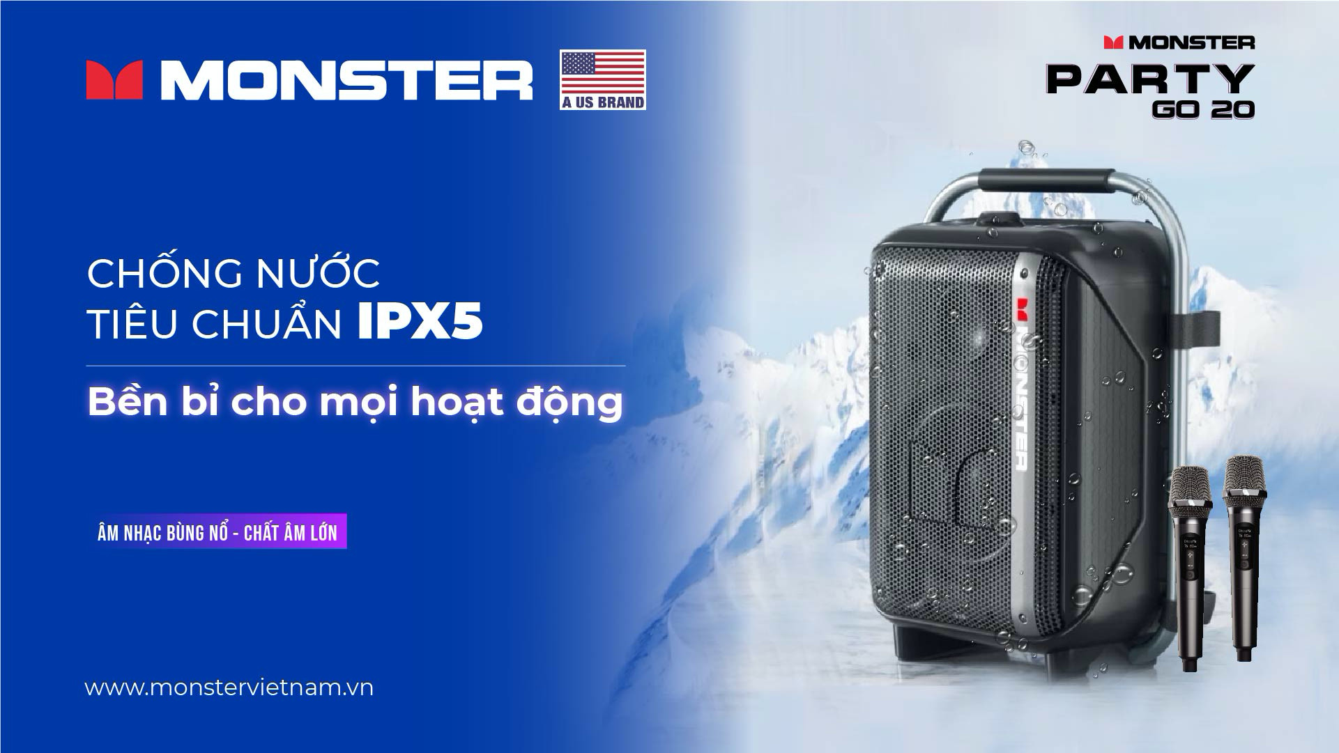 Loa karaoke Monster Party Go 20 được trang bị khả năng chống nước IPX5, giúp bạn yên tâm sử dụng trong mọi điều kiện thời tiết.