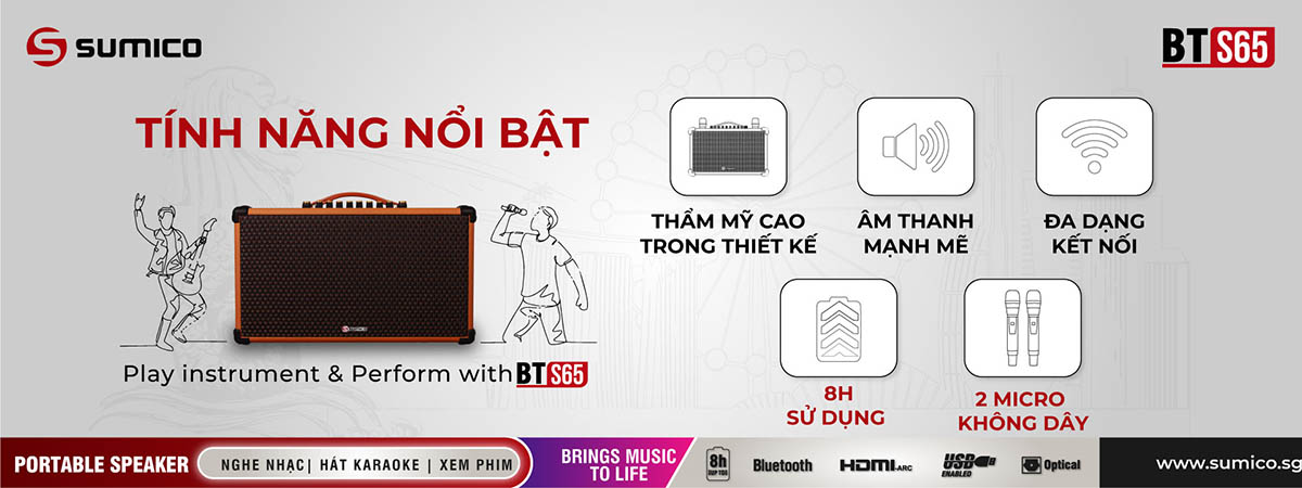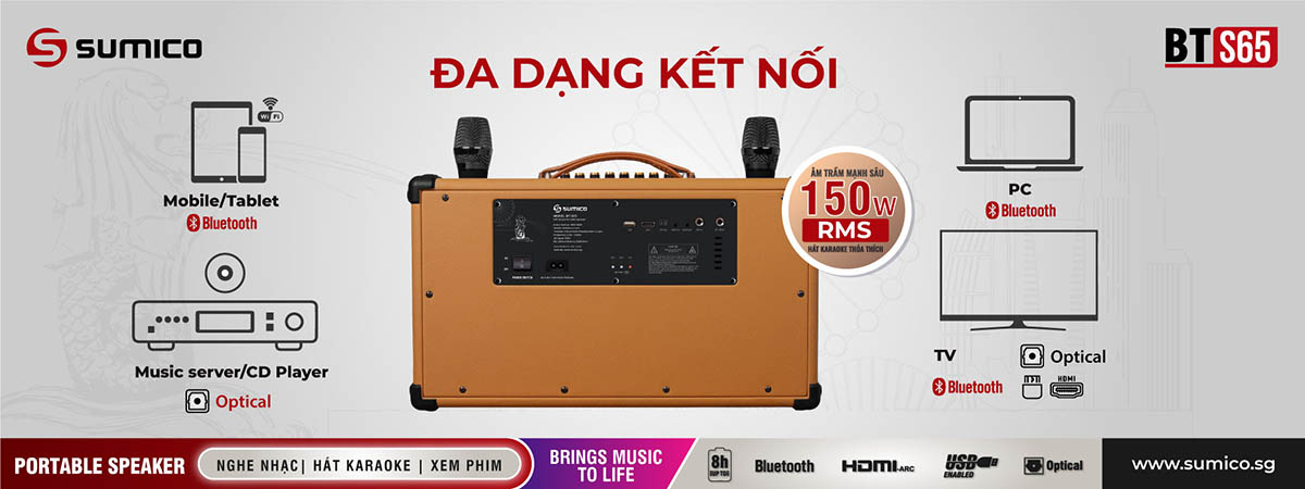 Ngoài dùng xách tay di động cho những chuyến đi xa, loa Sumico BT-S65 còn có thể sử dụng như một Rạp Hát Di Động cao cấp tại gia dễ dàng kê đặt di chuyển linh hoạt qua lại giữa phòng khách và phòng ngủ... Kết nối loa Sumico BT-S65 với Smart Tivi qua ngõ vào Optical, HDMI-ARC hoặc truyền phát bằng Bluetooth giúp bạn thưởng thức âm thanh sống động tuyệt vời hơn khi hát karaoke, xem phim, nghe nhạc hoặc tận hưởng bất kỳ chương trình giải trí nào, âm thanh sẽ tràn ngập không gian của bạn.