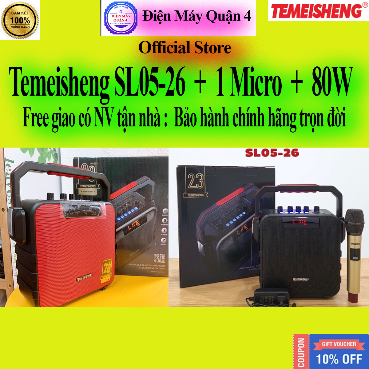 Loa bluetooth-karaoke Temeisheng SL05-26, mẫu loa karaoke xách tay cỡ nhỏ, công suất thực tầm 25W/ max 80W, âm thanh nghe chắc và chuẩn, bên trong loa tích hợp pin lithilium sạc lại, thiết bị tích hợp chức năng nghe nhạc qua điện thoại/ máy tính bảng qua kết nối không dây hoặc nghe nhạc từ USB/ thẻ nhớ ( định dạng mp3 mới nghe được), ngoài ra loa này còn sử dụng 02 không dây và có thêm một cổng cắm microphone nữa ( có nơi có kèm thêm 1 cặp mic không dây + đầu thu nhỏ, nếu quý khách có nhu cầu mua thêm thì giá một bộ này là 550K). Ngoài nghe nhạc ra thì loa này còn có thể dùng để thay thế may tro giang cho giao viên hoặc dùng tốt trong phòng họp/ dễ mang theo khi đi chơi xa.....