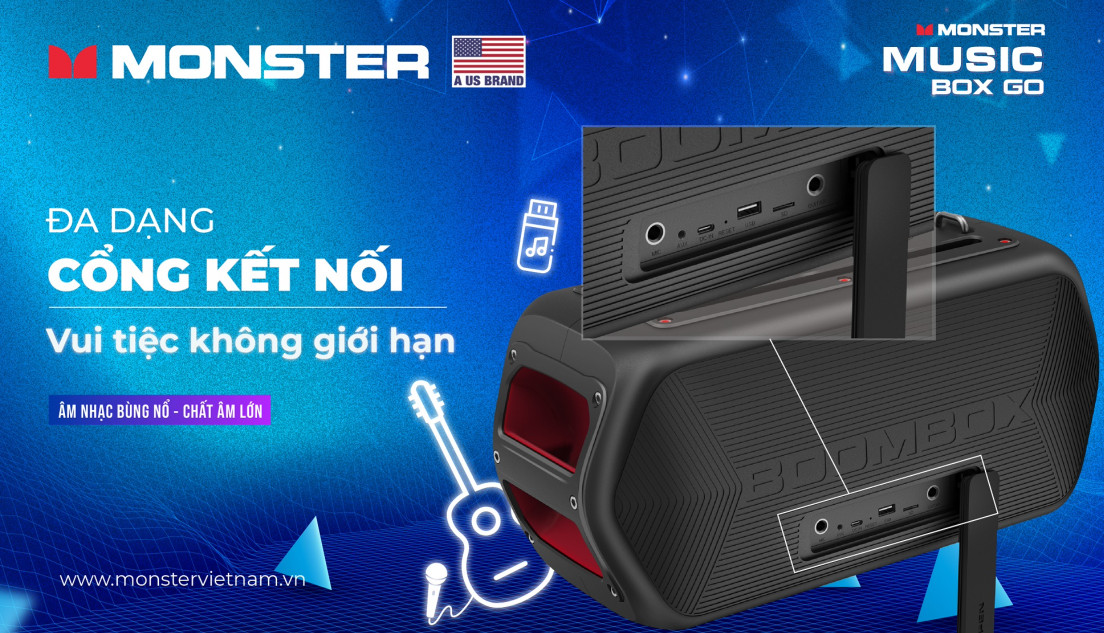 - Tính năng đa dạng: Loa Monster Musicbox Go hỗ trợ kết nối Bluetooth 5.1, USB, MicroSD Card, AUX IN, Micro In, Guitar In, cổng Micro In, cho phép bạn phát nhạc và hát karaoke từ nhiều nguồn khác nhau.
