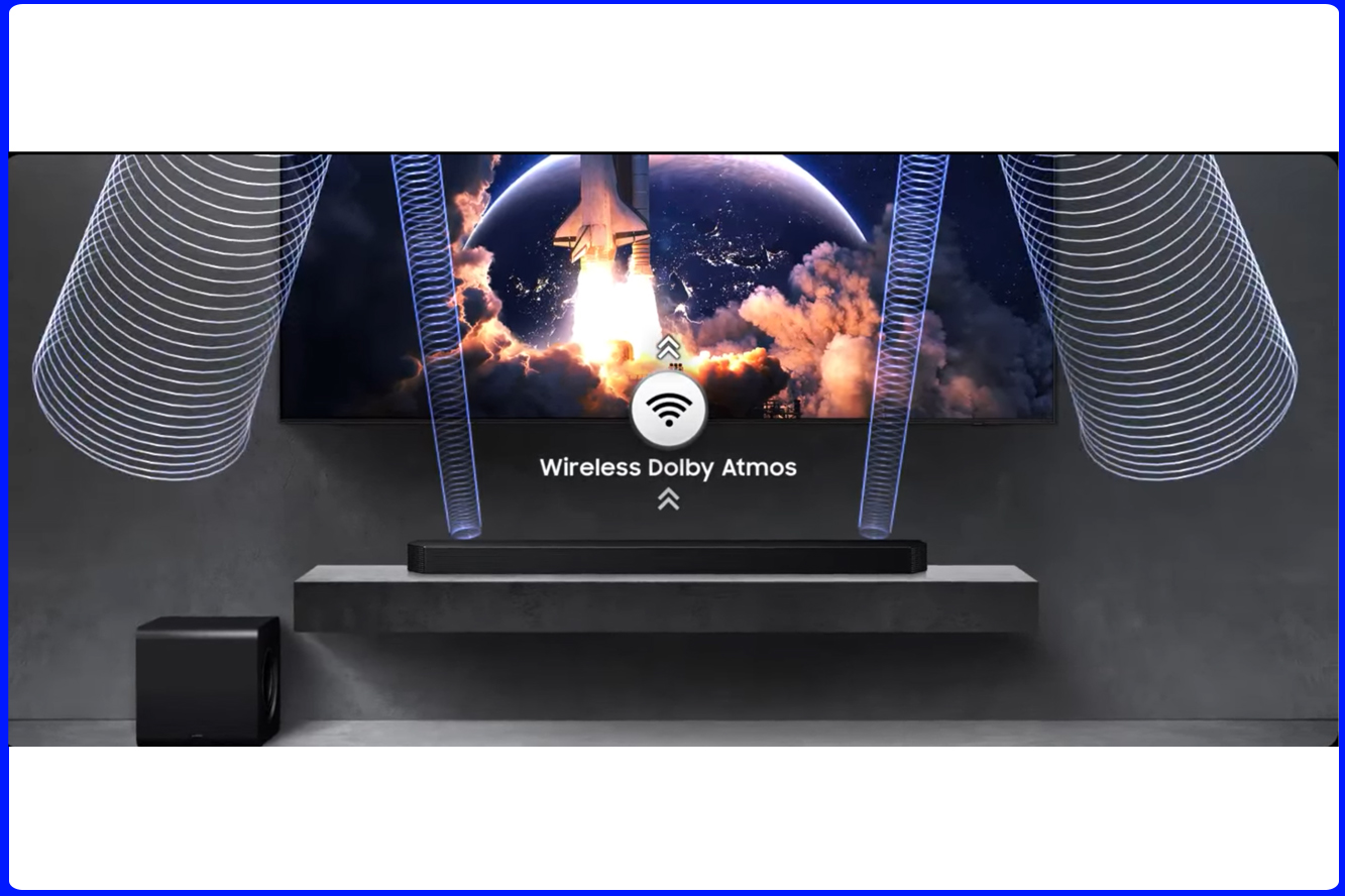 Công nghệ Wireless Dolby Atmos giúp kết nối âm thanh không dây từ loa đến các thiết bị tương thích, tạo ra không gian âm thanh 3D sống động mà không cần dùng đến cáp HDMI phức tạp. Điều này mang lại trải nghiệm âm thanh điện ảnh toàn diện, bao trùm toàn bộ phòng khách.