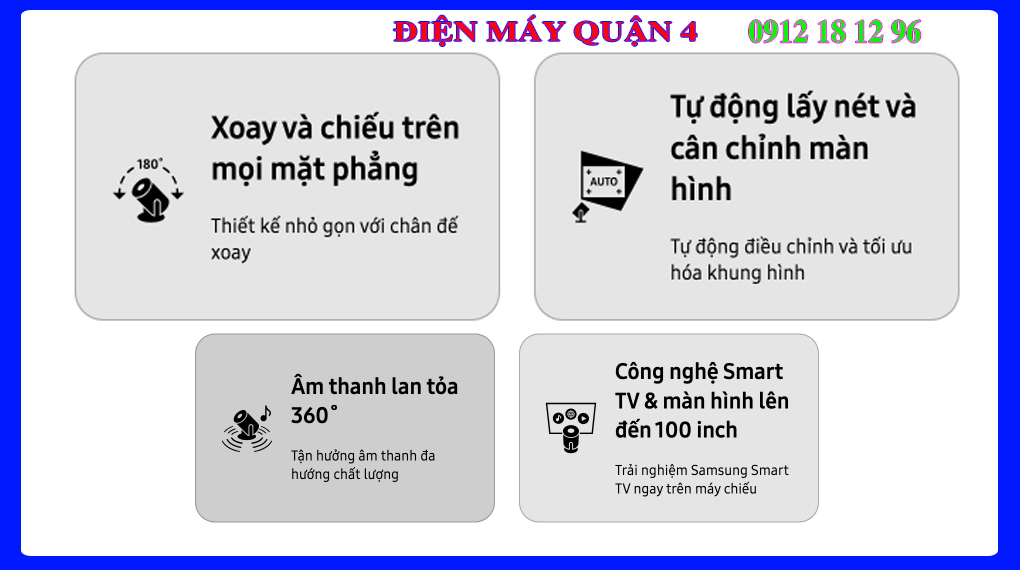Điện Máy Quận 4 là một trong những địa chỉ uy tín chuyên cung cấp các sản phẩm điện tử, điện máy chính hãng, trong đó có máy chiếu Samsung The Freestyle thế hệ 2. Tại đây, bạn sẽ được trải nghiệm sản phẩm trực tiếp, được tư vấn tận tình từ đội ngũ nhân viên chuyên nghiệp và nhận được chế độ bảo hành chính hãng từ Samsung.