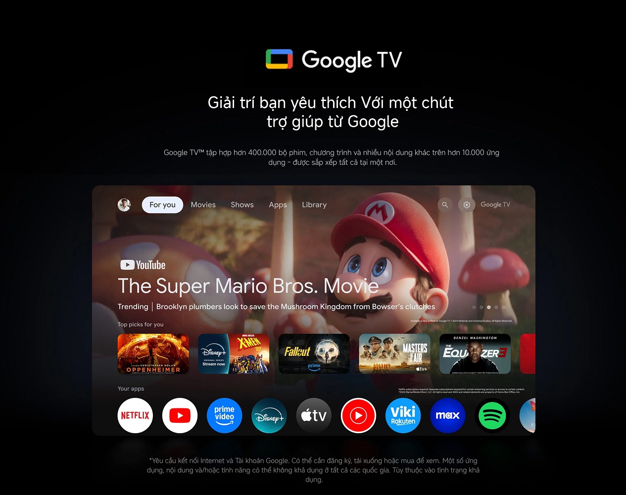 Hỗ trợ Android TV™ OS, người dùng có thể dễ dàng truy cập hàng nghìn ứng dụng, trò chơi, và nền tảng giải trí như Netflix, Disney+, YouTube, FPT Play,...