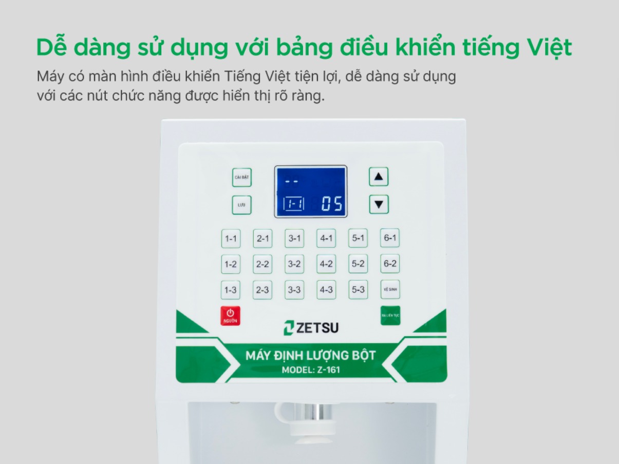 Zetsu ZT-161 được trang bị bảng điều khiển tiếng Việt trực quan, giúp nhân viên dễ thao tác dù mới làm quen. Nhờ đó, quy trình pha chế trở nên đơn giản, nhanh gọn, đồng thời nâng cao năng suất trong giờ cao điểm.