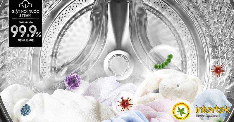 Công nghệ giặt hơi nước Steam Wash trong máy giặt Casper WF-8VG1 giúp loại bỏ vết bẩn cứng đầu và vi khuẩn hiệu quả. Khi sử dụng chế độ này, hơi nước được phun trực tiếp vào quần áo, giúp làm sạch sâu và diệt khuẩn.