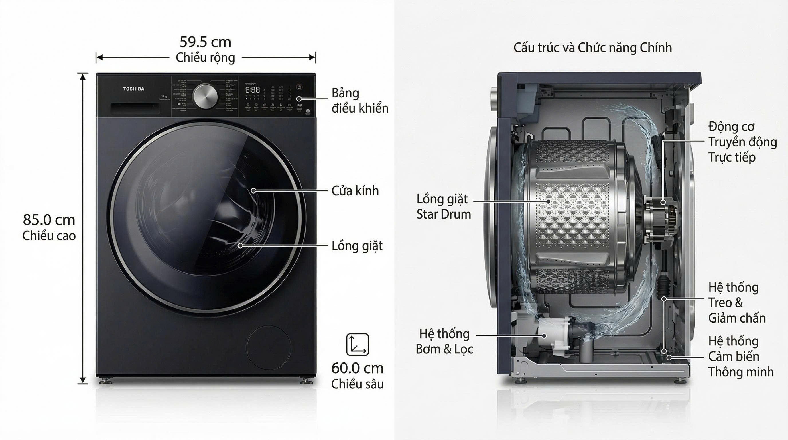 | Đặc điểm | Toshiba TW-T33B120UWV(MK) | Máy giặt thông thường |