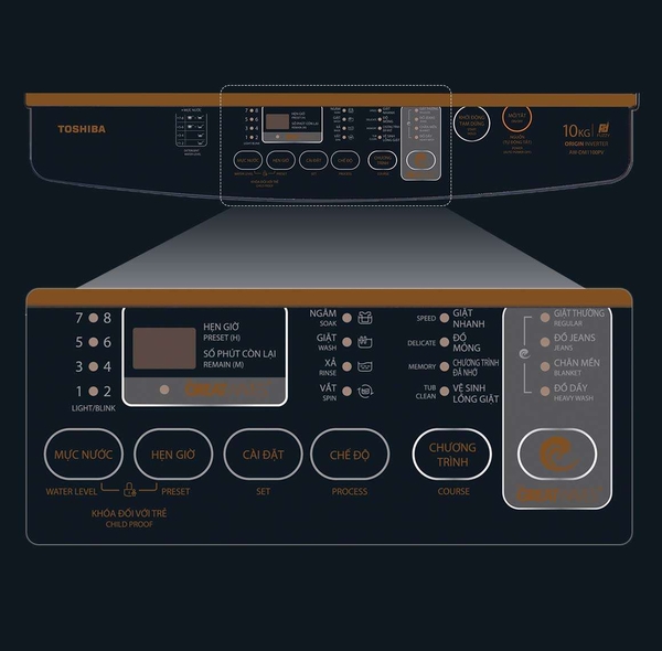 Bảng điều khiển tiện lợi và an toàn Bảng điều khiển kháng nước với các chỉ số rõ ràng. Nút bấm chìm, nhẹ nhàng trên bề mặt giúp bạn dễ dàng điều chỉnh chế độ giặt phù hợp. Bảng điều khiển hiển thị đầy đủ thông tin giặt để bạn không cần phải lo lắng về cách sử dụng máy.