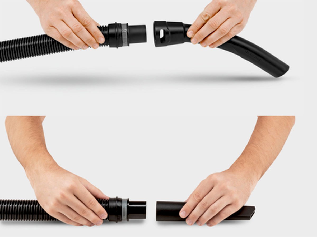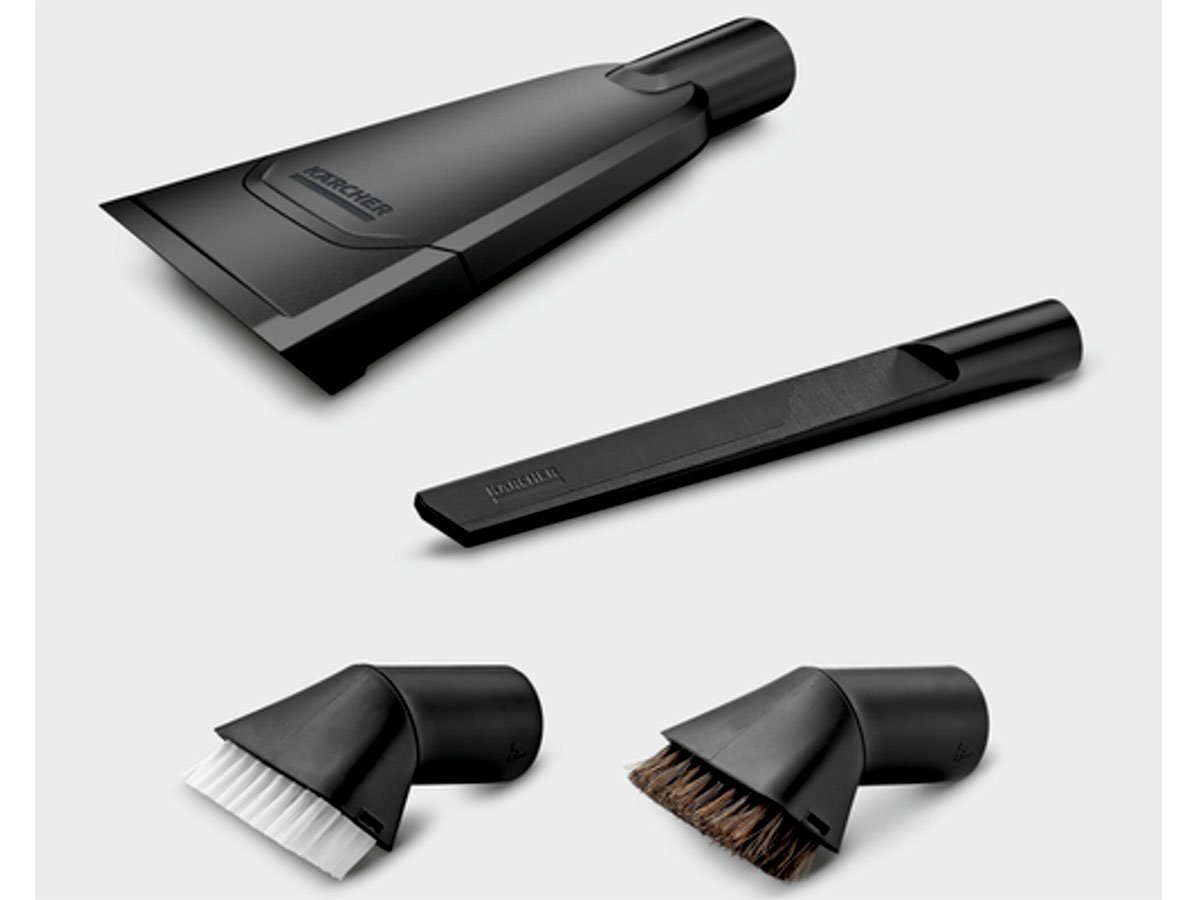 Máy hút bụi công nghiệp được trang bị các phụ kiện đặc biệt như đầu hút xe hơi, bàn chải hút với lông mềm và cứng, đầu hút khe hở dài, giúp làm sạch các khu vực khó tiếp cận trong xe như bảng điều khiển, khu vực chân và các khe hẹp giữa ghế.