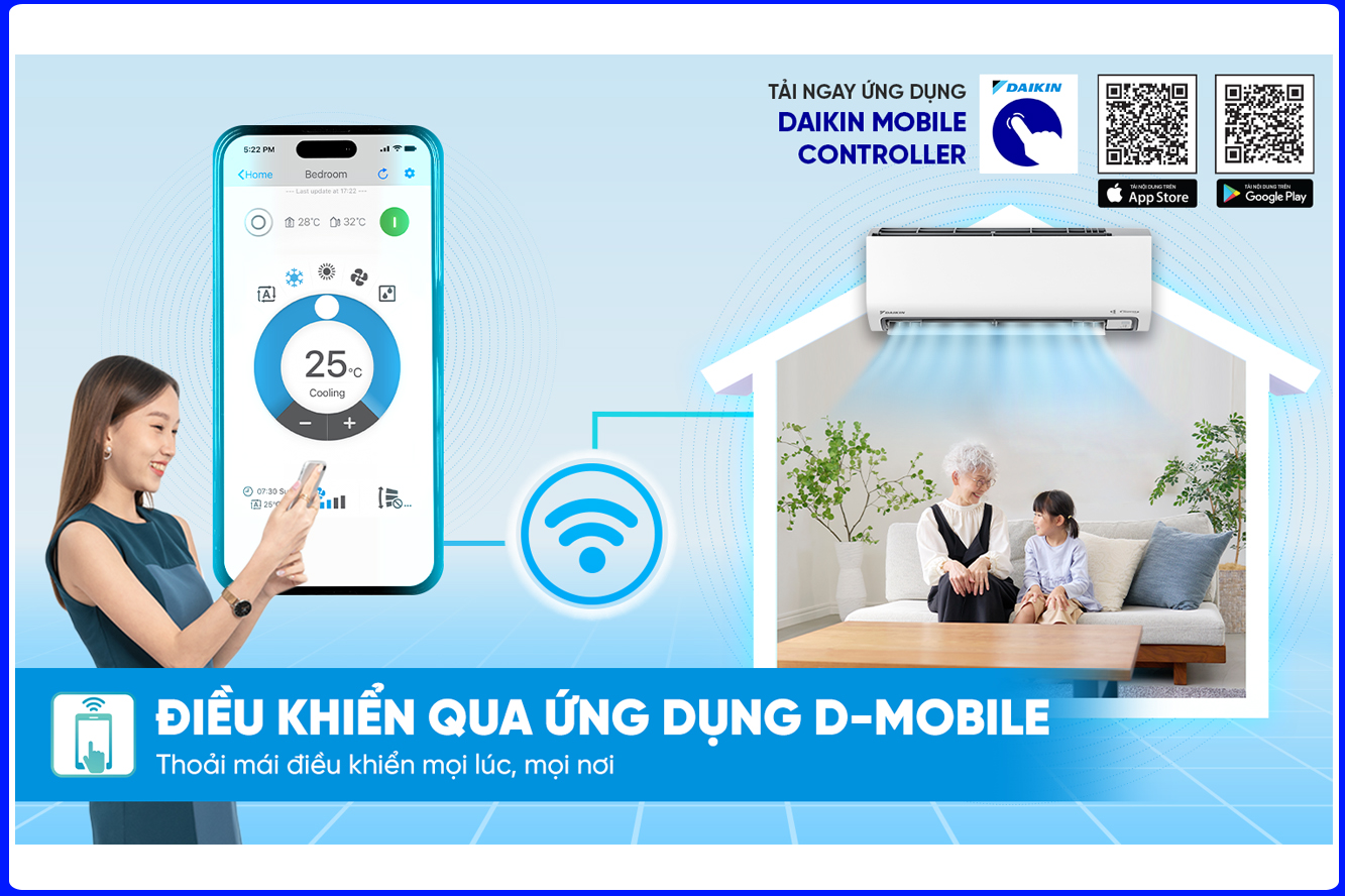 Với ứng dụng D-Mobile, bạn có thể điều khiển Máy lạnh Daikin inverter 1HP FTKF25ZVMV từ xa qua điện thoại. Tính năng này cho phép bật/tắt máy, điều chỉnh nhiệt độ, tốc độ quạt, lập lịch hoạt động hàng tuần hoặc hẹn giờ mở máy trước khi về nhà, mang lại sự tiện nghi tối đa.