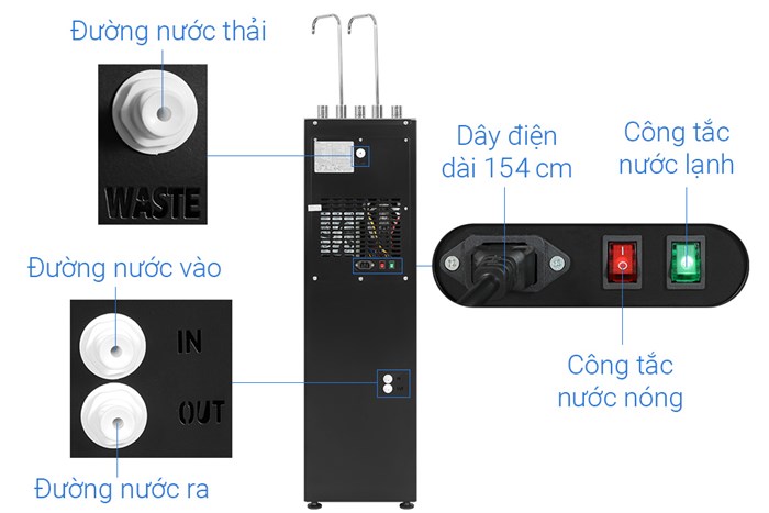 - Công suất: Lọc nước (30W), Nước lạnh (70W), Nước nóng (528W)