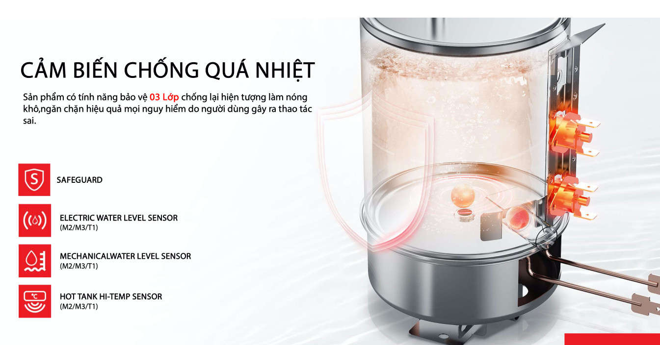 | Hệ thống bảo vệ | Tự động sục rửa màng RO, báo động khi cần thay lõi lọc, khóa trẻ em an toàn |