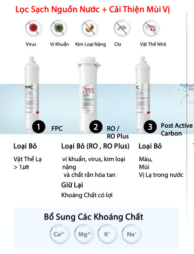 + Lõi 2-RO: Lọc vi khuẩn, virus, kim loại nặng và chất rắn hòa tan. Giữ Lại Khoáng Chất có lợi