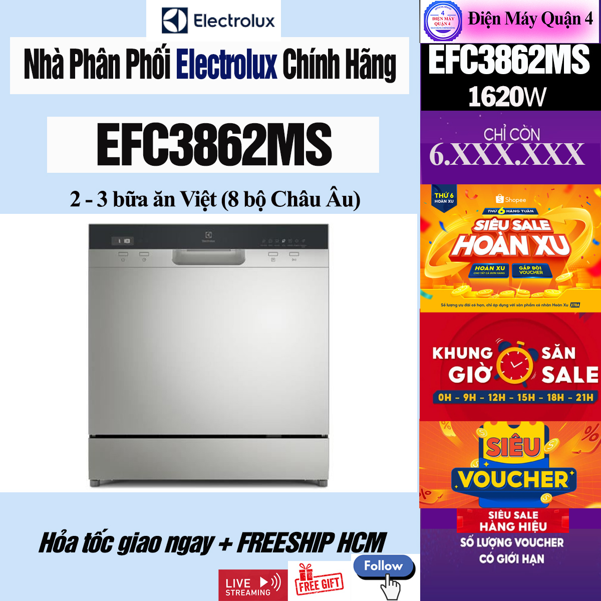 Bạn có thể đặt mua Máy rửa chén mini Electrolux EFC3862MS chính hãng với giá tốt nhất tại các cửa hàng điện máy lớn hoặc đặt hàng trực tuyến trên Shopee, Lazada, Tiki,... để nhận ngay ưu đãi hấp dẫn!