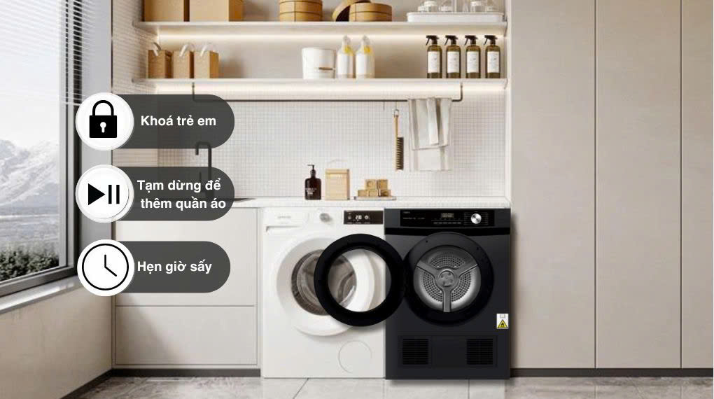 Các tiện ích như hẹn giờ sấy, khóa trẻ em, tùy chỉnh thời gian và nhiệt độ sấy giúp người dùng linh hoạt hơn trong quá trình sử dụng, đồng thời đảm bảo an toàn khi trong nhà có trẻ nhỏ.