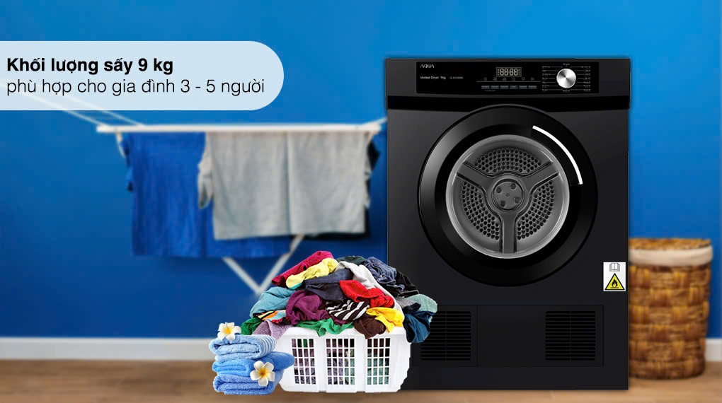 Với khối lượng sấy lên đến 9 kg, máy sấy Aqua AQH-V901K PS đáp ứng tốt nhu cầu sử dụng của gia đình từ 3 đến 5 thành viên, giúp bạn tiết kiệm thời gian sấy đồ và không cần gom quần áo quá lâu mới giặt một lần.