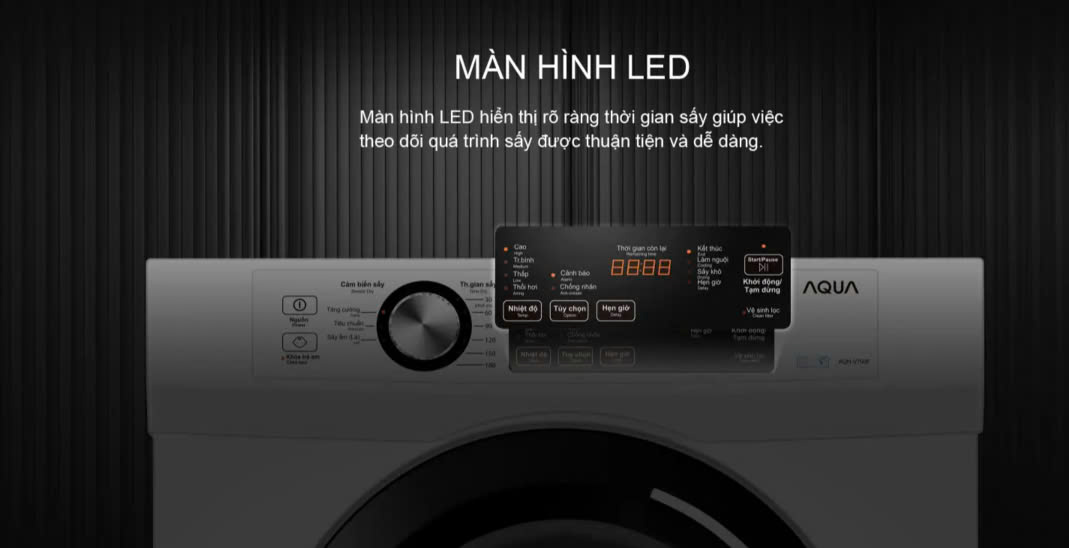 Máy sấy được trang bị bảng điều khiển hiện đại với màn hình LED rõ ràng, cùng các nút nhấn và núm vặn dễ thao tác. Giao diện song ngữ Anh - Việt giúp mọi đối tượng người dùng dễ dàng tiếp cận và sử dụng.