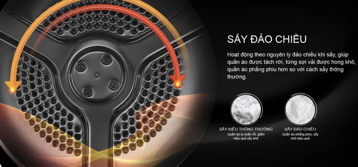 Công nghệ sấy đảo chiều giúp quần áo được nhào trộn đều trong quá trình sấy, giảm nhăn và hạn chế tình trạng rối. Điều này không chỉ tiết kiệm thời gian là ủi mà còn bảo vệ chất liệu vải khỏi hư hỏng.