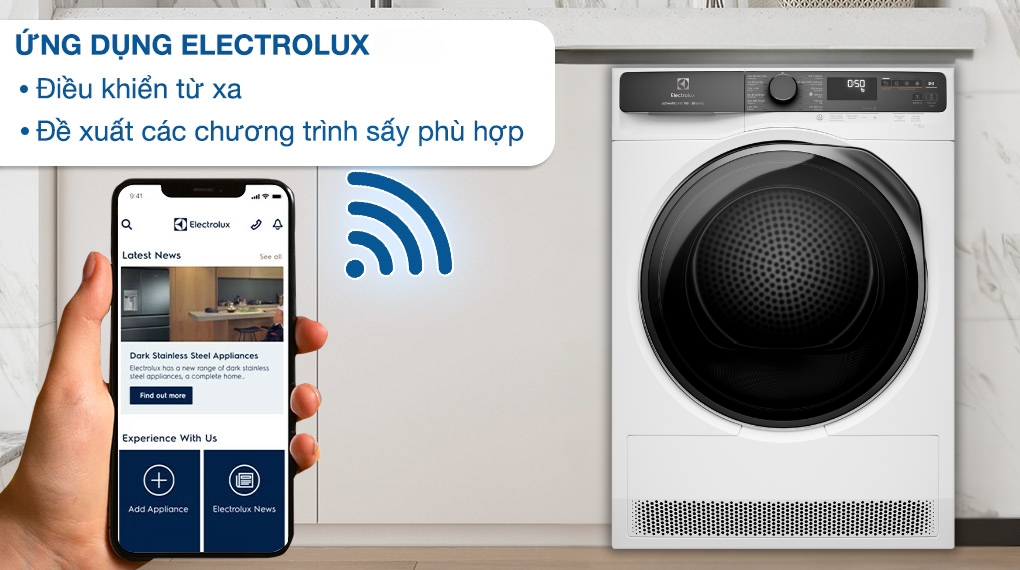 Kết nối điện thoại qua ứng dụng Electrolux Life, cho phép điều khiển từ xa, hẹn giờ, kiểm tra trạng thái máy dễ dàng.