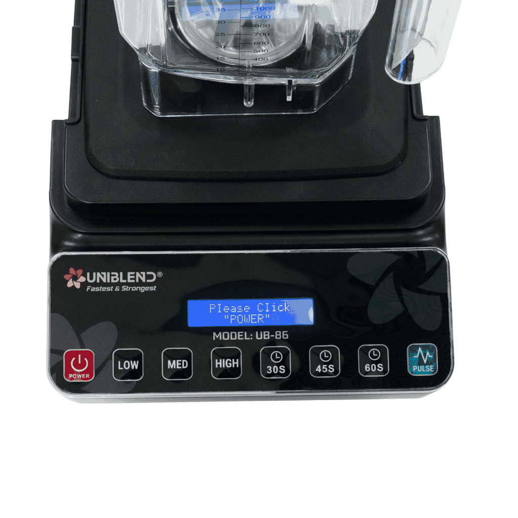 Bảng điều khiển của Uniblend UB-86 được thiết kế đơn giản với nút bấm cơ, chia thành hai nhóm chức năng rõ ràng. Có 3 phím tốc độ: Low (thấp), Med (vừa) và High (cao), cho phép điều chỉnh linh hoạt theo độ cứng của nguyên liệu. Bên cạnh đó, 3 phím xay tự động (30s, 45s, 60s) được lập trình sẵn để xay nhanh chóng từ 1 đến 4 ly đồ uống. Chỉ cần một nút bấm, máy sẽ tự đảo đều nguyên liệu mà không cần que khuấy, giúp nhân viên rảnh tay chuẩn bị các bước tiếp theo.