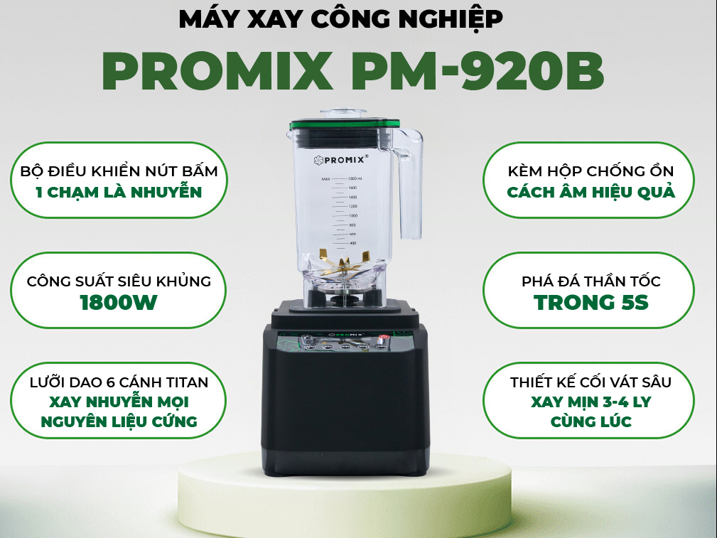 Promix PM-920B sở hữu công suất lớn lên tới 1.800W cho phép người dùng pha chế nhanh hơn và nhiều hơn với các loại nguyên liệu cứng một cách mượt mà nhưng vẫn giữ nguyên được độ tươi ngon và hương vị tự nhiên.