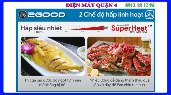 Công nghệ SuperHeat của Nồi Chiên Không Dầu 2Good S100 là một công nghệ hấp siêu nhiệt, giúp hấp các món ăn với hơi nước siêu nhiệt có nhiệt độ trên 100 độ C, thậm chí lên tới 115 độ C. Nhờ vậy, các món ăn được hấp trong nồi sẽ chín đều và nhanh hơn, giữ được độ ẩm và dinh dưỡng của thực phẩm, không bị khô hay mất vị.