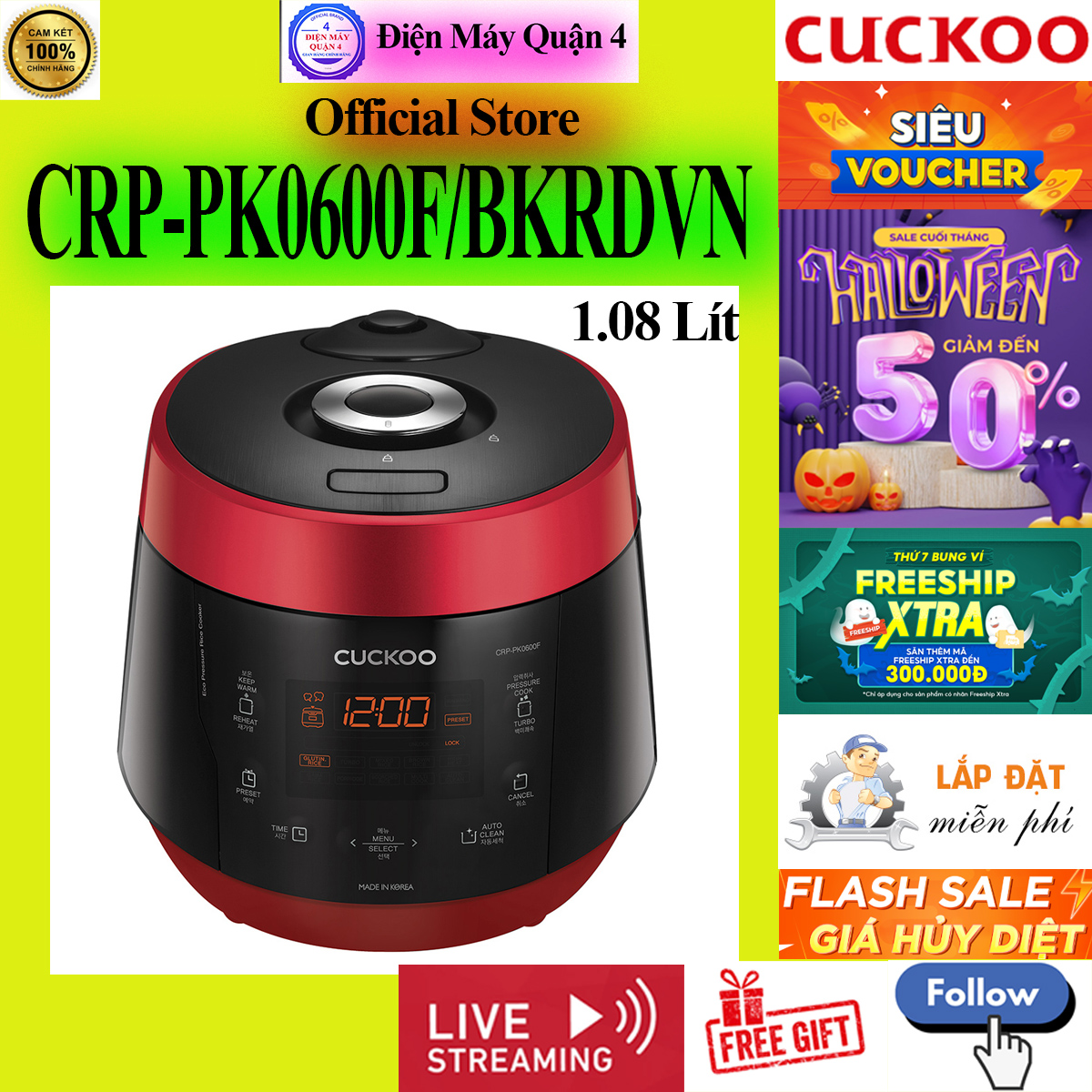 Nồi cơm điện tử áp suất 1.08 lít Cuckoo CRP-PK0600F/BKRDVN nhập khẩu từ Hàn Quốc, mẫu mã hiện đại, lòng nồi phủ chống dính Xwall Black Coating, nhiều chế độ nấu cài sẵn,... là thiết bị vừa tiện nghi vừa sang đẹp cho không gian bếp.