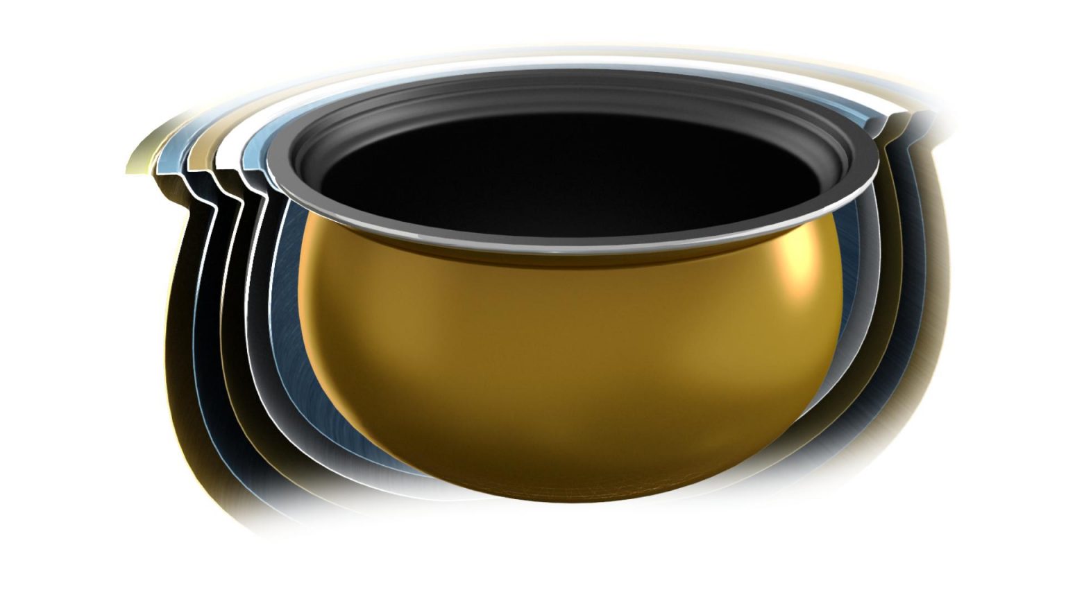 - Lòng nồi hình cầu 5 lớp bằng hợp kim nhôm đúc nguyên khối dày 2.4mm