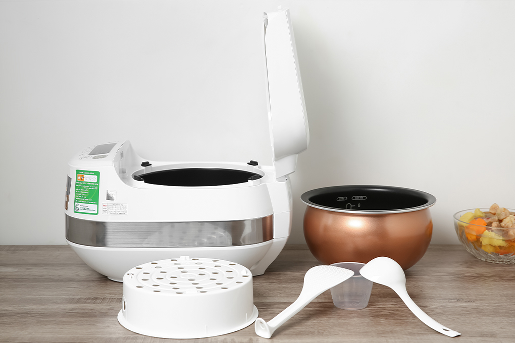 Đi kèm phụ kiện vá cơm, vá múc canh, cốc đong gạo, xửng hấp tiện lợi.