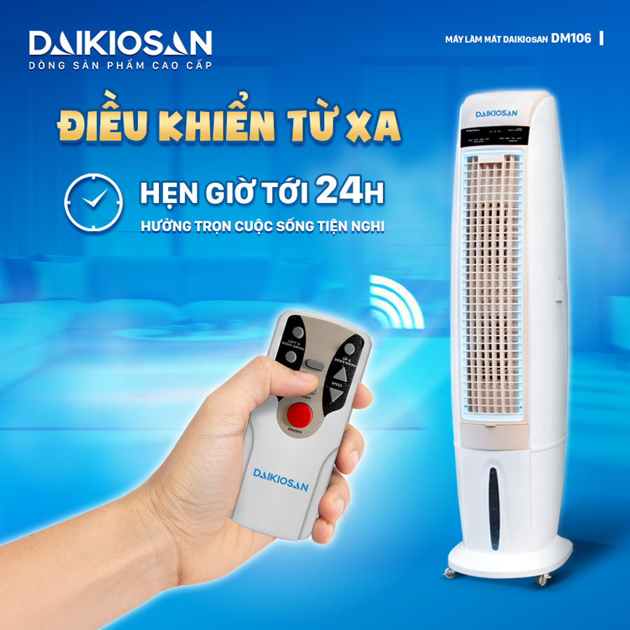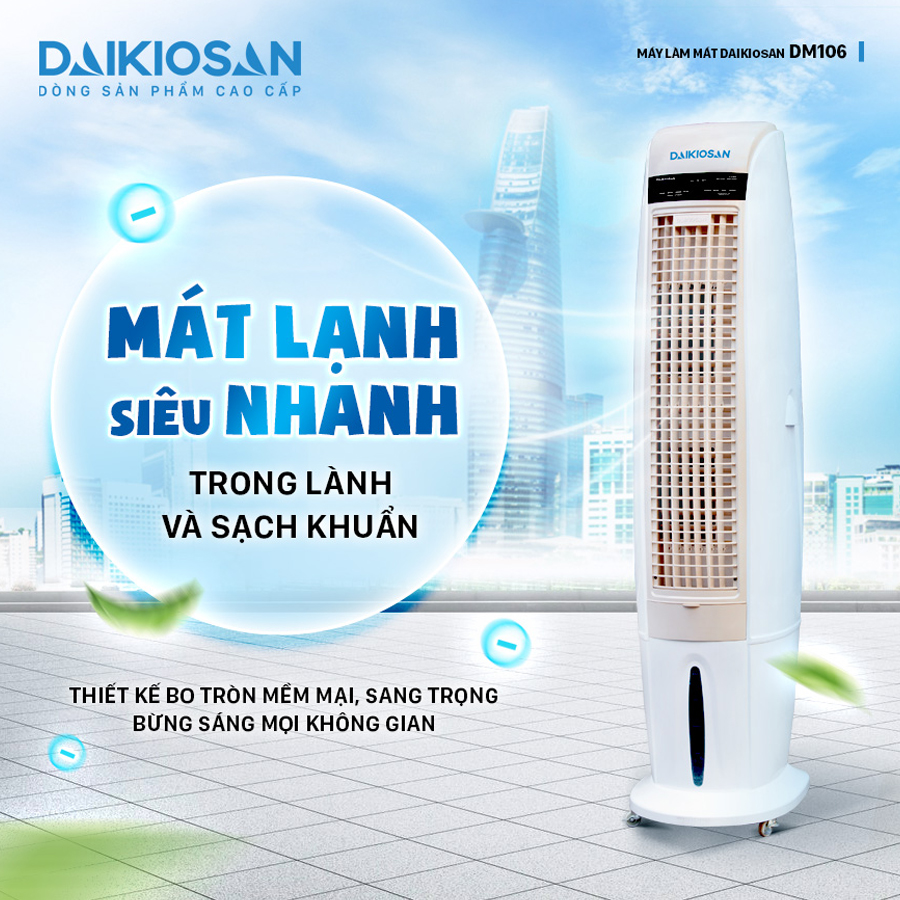 Quạt điều hòa Daikiosan DM106 mang lại hiệu suất mát mẻ với công suất tổng 350W, phù hợp với diện tích làm mát từ 30m2 đến 45m2. Với 3 tốc độ và lưu lượng gió từ 3.500 đến 4.000 m3/h, tốc độ gió đạt 15-16 m/s.Dung tích 40L và tiêu thụ nước 2-4 L/h. Điều khiển từ xa và hẹn giờ lên đến 24 tiếng. Sở hữu tính năng an toàn với tự ngắt khi bơm nước không đủ.
