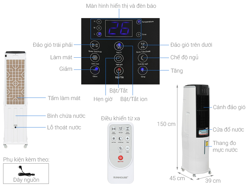 - Dung tích bình chứa nước 45 lít, giúp quạt hoạt động trong thời gian dài mà không cần châm nước liên tục.