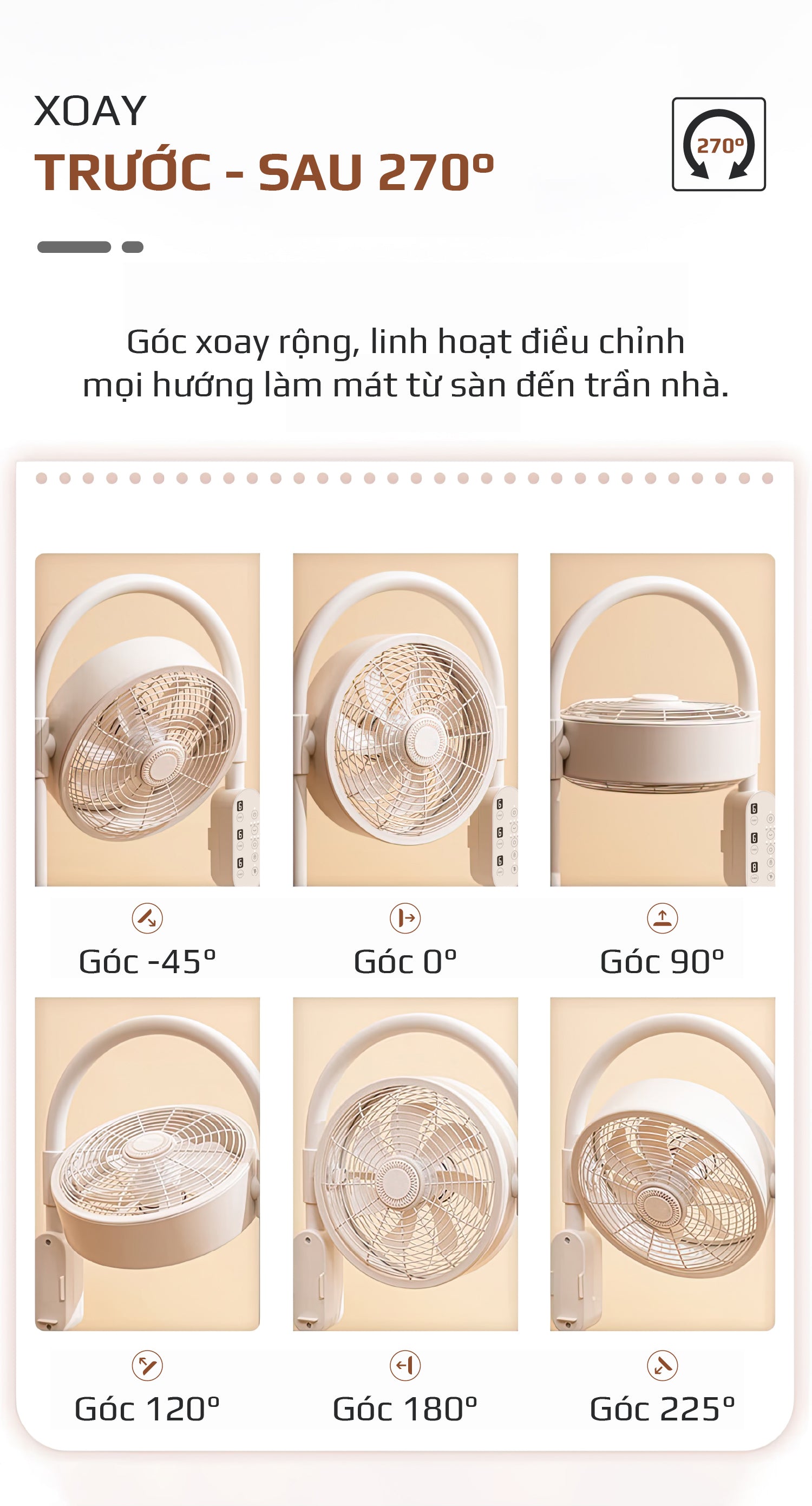 Góc quay rộng, linh hoạt điều chỉnh mọi hướng làm mát được từ mặt sàn đến trần nhà. Góc quạt sàn -45 độ có thể tập trung làm mát sàn nhanh chóng thoải mái cho trẻ con nô đùa dưới sàn nhà. Góc 120 độ có thể làm mát trên trần nhà, đối lưu không khí trong phòng tốt hơn. Đảm bảo sử dụng quạt lâu dài mà luôn dễ chịu không gây đau đầu, bạt hơi.