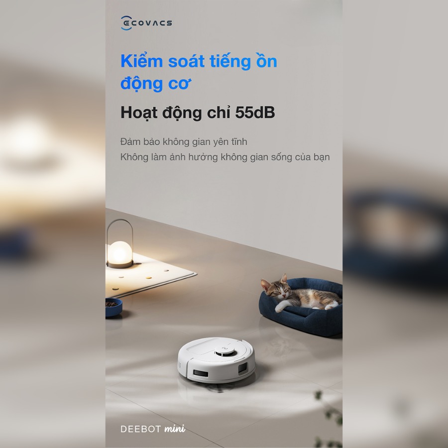 Nhờ động cơ không chổi than và cấu trúc giảm rung đặc biệt, Ecovacs Deebot Mini hoạt động ở mức âm thanh 55–60dB (khi hút/lau) và 70dB (khi đổ rác).