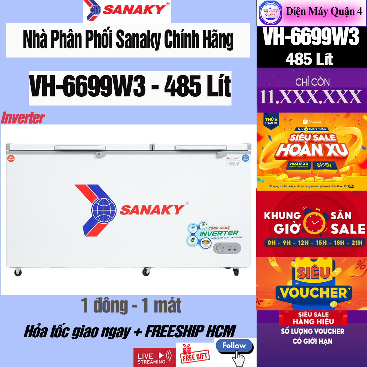 Nhìn chung, tủ đông Sanaky Inverter 485 lít VH-6699W3 được trang bị đầy đủ các tiện ích bổ trợ người dùng như bánh xe, khóa cửa tủ, lỗ thoát nước dễ dàng vệ sinh,... Công nghệ tiết kiệm điện hạn chế lượng điện năng hao phí nhưng vẫn đảm bảo khả năng làm lạnh nhanh chóng, ổn định nhờ vào cơ chế làm lạnh trực tiếp của tủ đông.