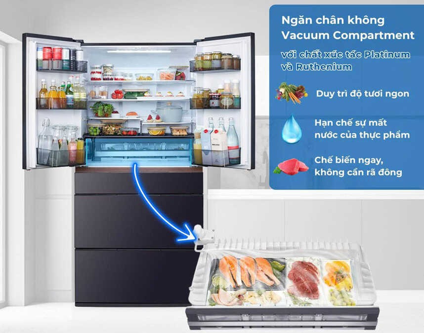 Ngăn chân không độc quyền của Hitachi sử dụng chất xúc tác Platinum và Ruthenium, tạo áp suất thấp chỉ khoảng 0.8 atm, giúp giảm oxy hóa, bảo toàn vitamin và dưỡng chất trong thực phẩm.