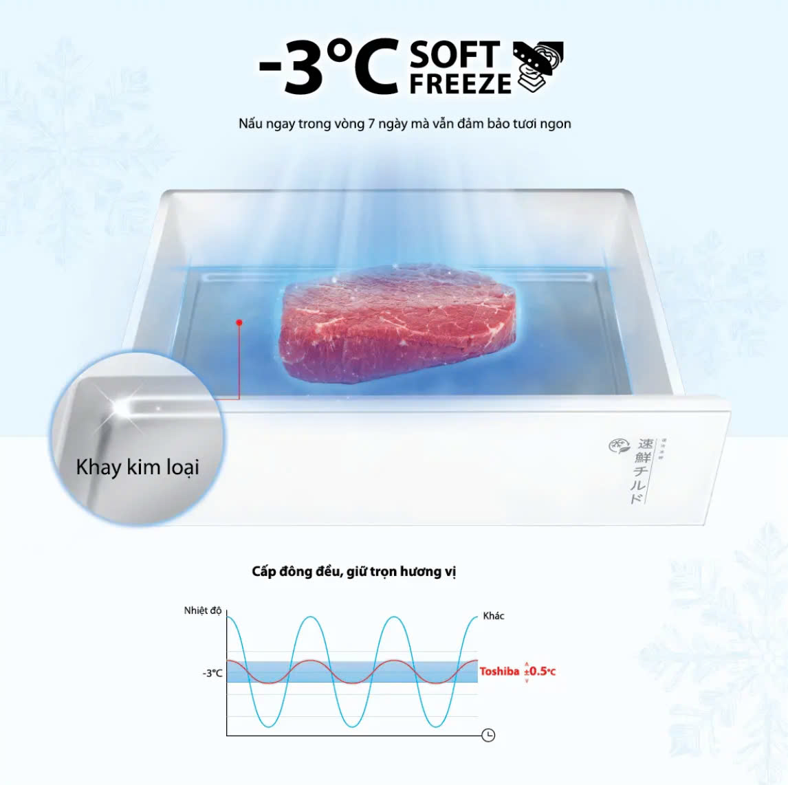 Ngăn đông mềm giữ thịt cá tươi ngon đến 7 ngày ở nhiệt độ -3°C mà không cần rã đông, giữ nguyên dưỡng chất và hương vị.