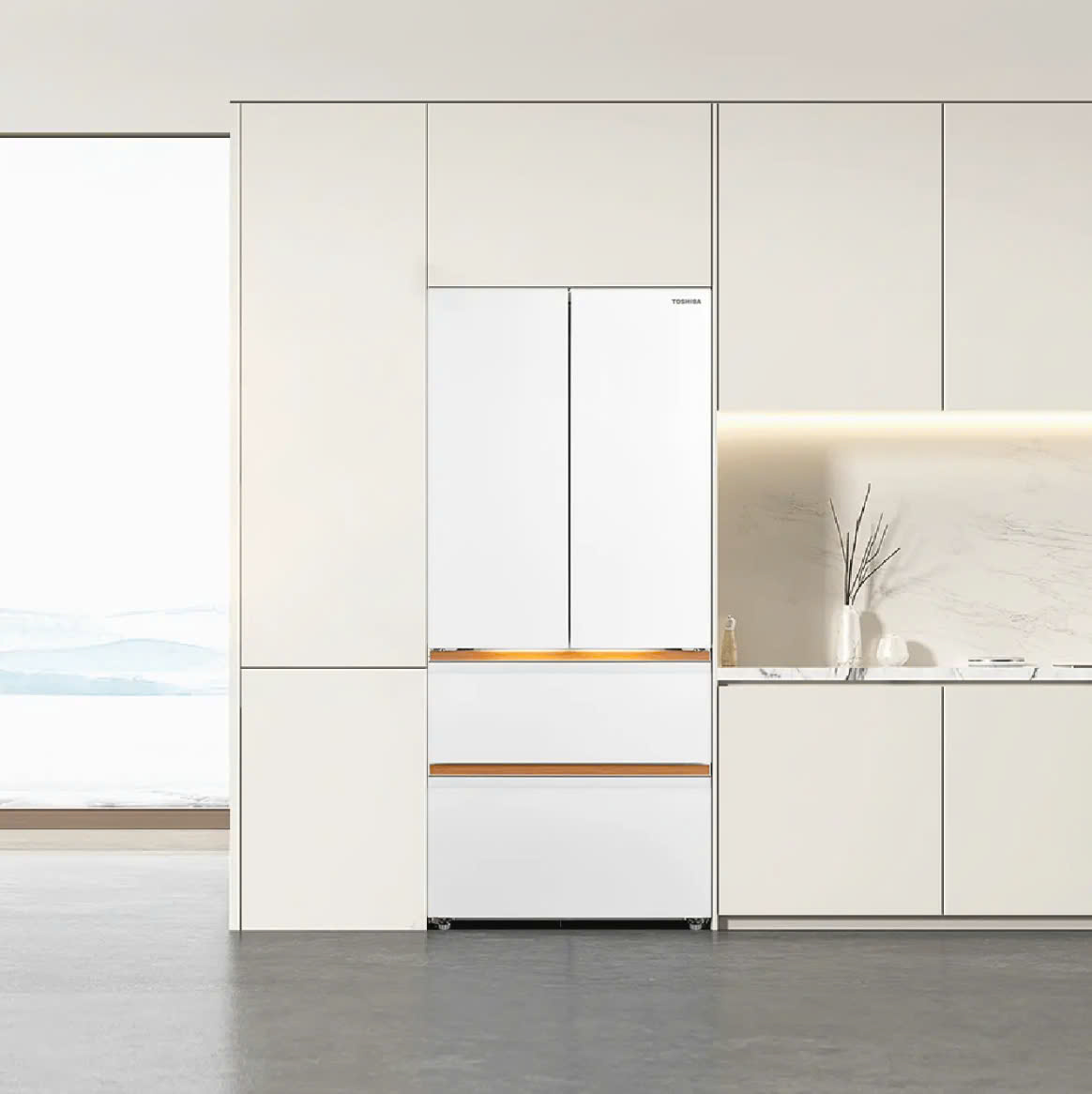 Thiết kế Japandi của Toshiba kết hợp tinh tế giữa sự đơn giản của Nhật Bản và sự sang trọng của phong cách Scandinavian. Bề mặt tủ được làm từ kính Fuji Nano trắng phủ 10 lớp, không chỉ đẹp mắt mà còn dễ dàng vệ sinh, chống bám vân tay và trầy xước. Với tay cầm âm và họa tiết vân gỗ, chiếc tủ lạnh này mang lại cảm giác hài hòa với thiên nhiên, đồng thời duy trì được vẻ đẹp lâu dài mà không bị ố vàng.